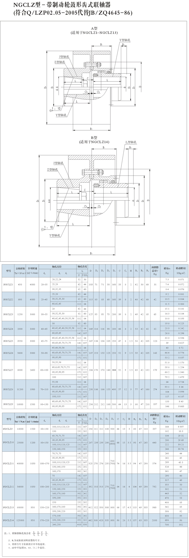 NGCLZ12帶制動輪鼓形齒式聯(lián)軸器的結構是由兩具有相同齒數(shù)的外齒軸套和兩帶有凸緣的內齒圈零件組成。兩外齒軸套分別用鍵銜接固定在被鏈接兩軸的軸端,兩內齒圈的內齒與軸套上的外齒相嚙合,其凸緣用螺栓鏈接,從而完成兩軸的鏈接,外齒軸套及內齒圈上的齒輪為嚙合角a=20°的漸開線齒。NGCLZ型齒式聯(lián)軸器為帶制動輪式鼓形齒式聯(lián)軸器,詳細規(guī)格見下表。